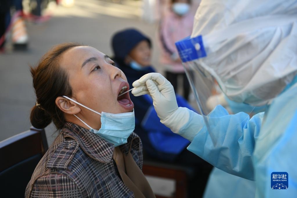 10月20日,在因疫情封控的阿拉善盟額濟(jì)納旗達(dá)來呼布鎮(zhèn)天賦佳苑小區(qū)內(nèi),醫(yī)務(wù)人員為居民進(jìn)行核酸采樣。新華社記者 貝赫 攝