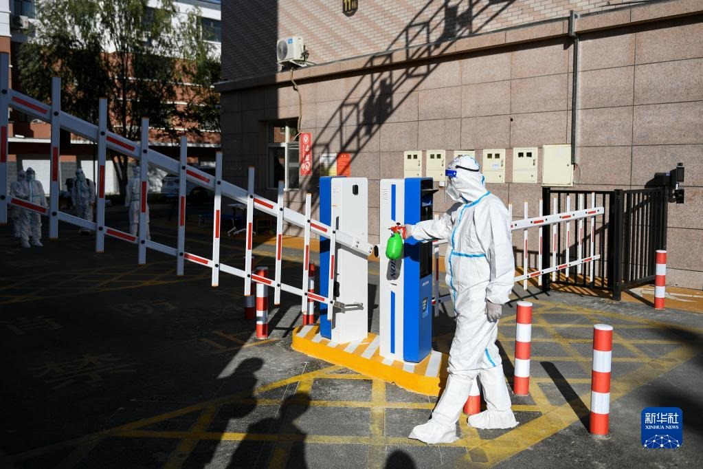 10月20日,在因疫情封控的阿拉善盟額濟(jì)納旗達(dá)來呼布鎮(zhèn)團(tuán)結(jié)小區(qū)內(nèi),社區(qū)工作人員進(jìn)行消殺工作。