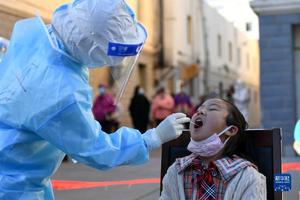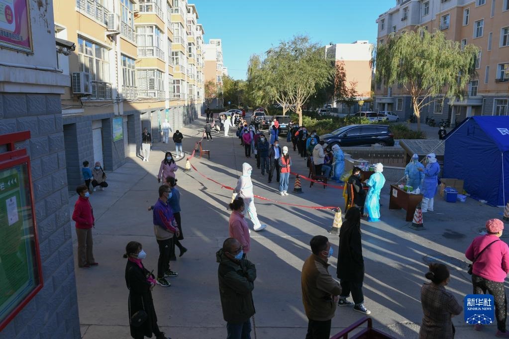 10月20日,在因疫情封控的阿拉善盟額濟(jì)納旗達(dá)來呼布鎮(zhèn)天賦佳苑小區(qū)內(nèi),核酸采樣工作有序開展。新華社記者 貝赫 攝