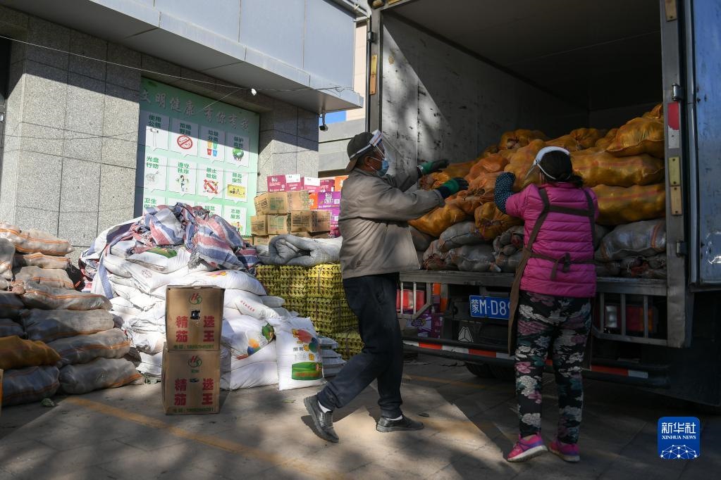 10月20日,在阿拉善盟額濟(jì)納旗達(dá)來呼布鎮(zhèn)民族生活超市外,超市員工在搬運(yùn)物資。新華社記者 貝赫 攝