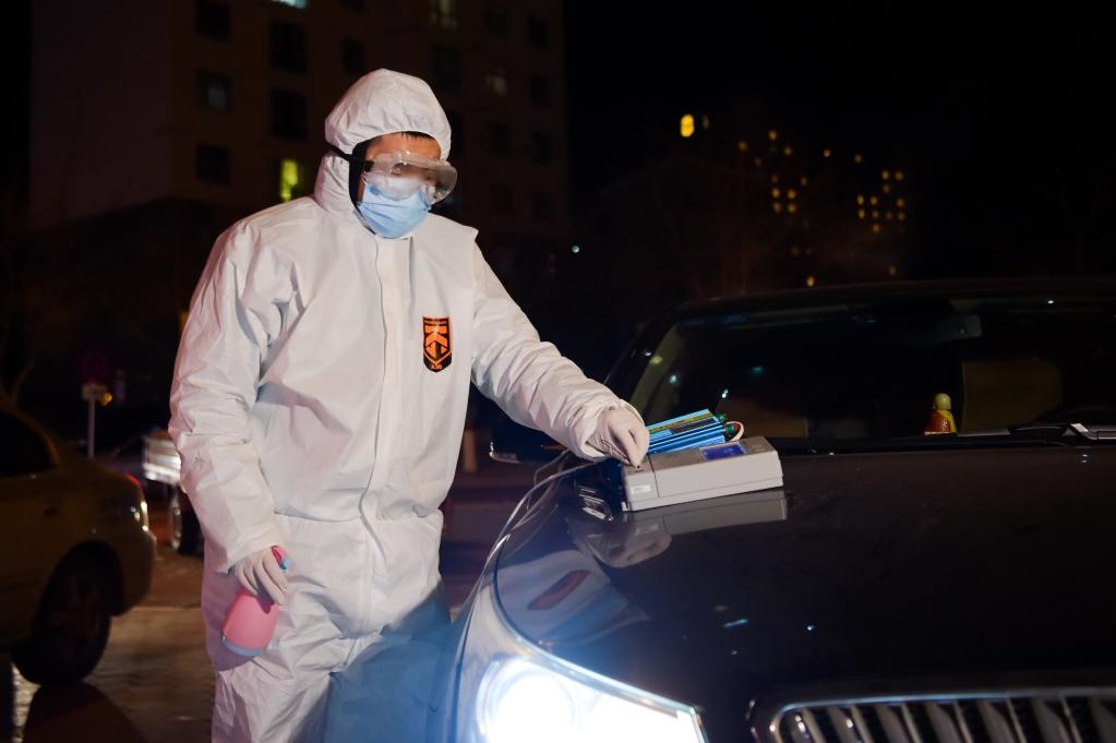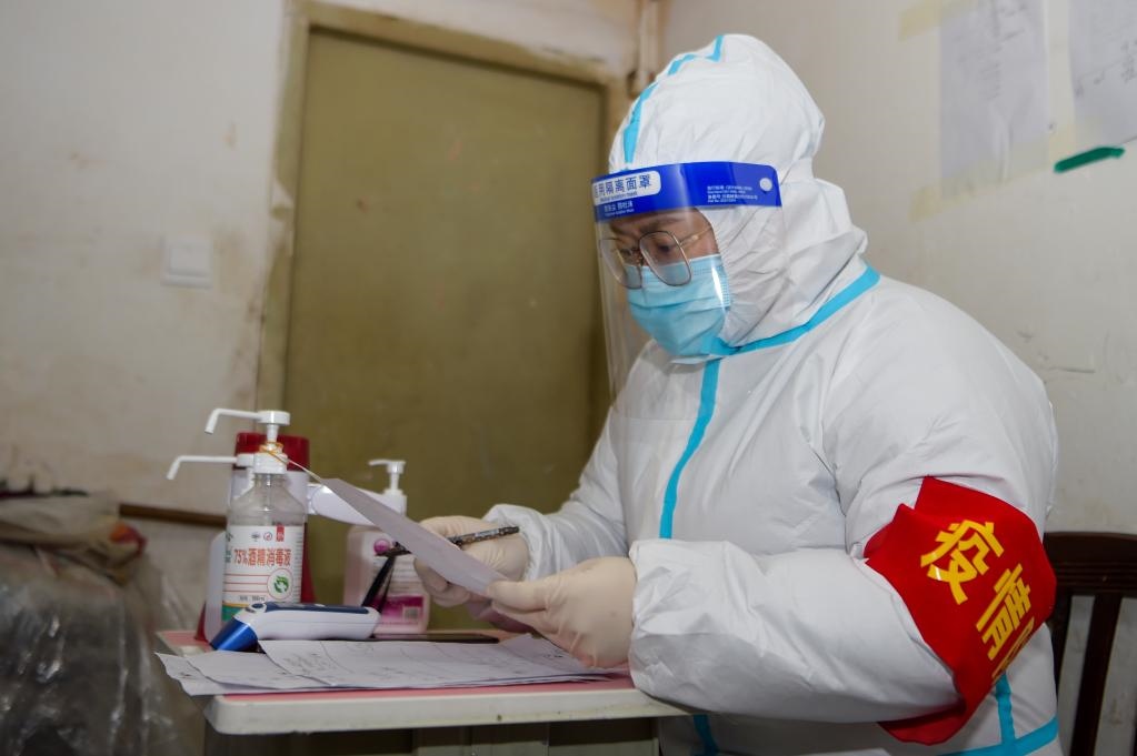 12月7日,在滿洲里市現(xiàn)代花園小區(qū),志愿者王力豐在核對居民信息。新華社記者李志鵬 攝
