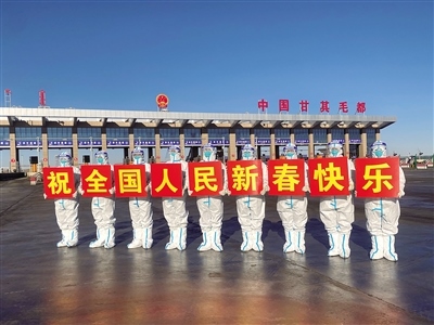 1月31日,民警在甘其毛都口岸貨運(yùn)通道祝全國(guó)人民新春快樂(lè)。春節(jié)期間,內(nèi)蒙古甘其毛都出入境邊防檢查站民警堅(jiān)守一線,為出入境車(chē)輛提供優(yōu)質(zhì)高效的通關(guān)服務(wù),守護(hù)萬(wàn)家燈火。(記者 孟和朝魯 通訊員 宋緒明 攝)
