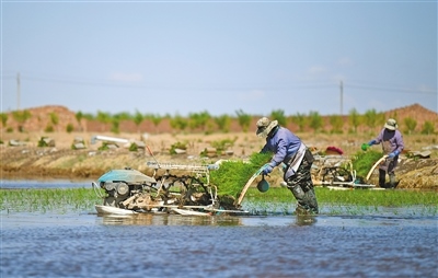 沙漠水稻插秧。本報記者孟和朝魯攝