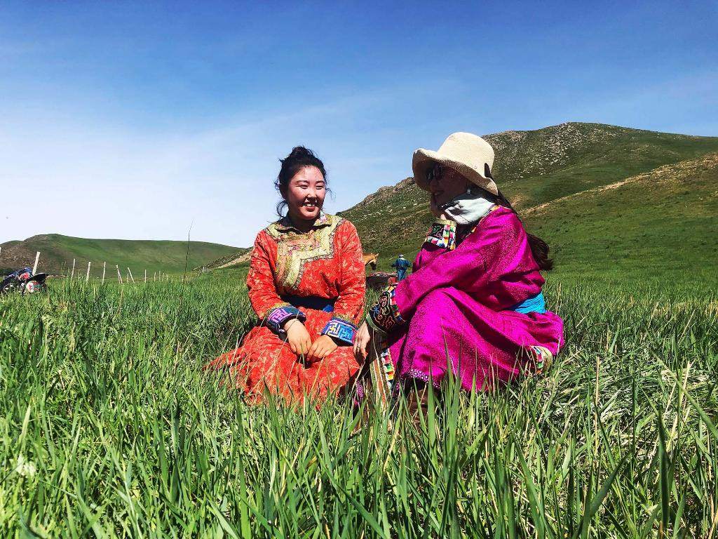 哈斯薩日嘎(左)與游客在草原上聊天。圖片由受訪者提供