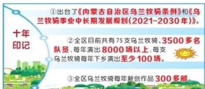 黨的十八大以來(lái),烏蘭牧騎事業(yè)發(fā)展進(jìn)入快車(chē)道。自治區(qū)制定了一系列加快推進(jìn)烏蘭牧騎事業(yè)發(fā)展的政策,出臺(tái)了《內(nèi)蒙古自治區(qū)烏蘭牧騎條例》和《烏蘭牧騎事業(yè)中長(zhǎng)期發(fā)展規(guī)劃(2021-2030年)》。設(shè)立全區(qū)烏蘭牧騎事業(yè)發(fā)展專(zhuān)項(xiàng)經(jīng)費(fèi),為75支烏蘭牧騎配備演出大巴車(chē),新建烏蘭牧騎宮,舉辦烏蘭牧騎藝術(shù)節(jié)、全區(qū)烏蘭牧騎新人新作比賽,開(kāi)展全區(qū)烏蘭牧騎交流演出、“烏蘭牧騎月”等活動(dòng),促進(jìn)烏蘭牧騎互相學(xué)習(xí)發(fā)展。開(kāi)發(fā)“網(wǎng)上烏蘭牧騎”P(pán)C版網(wǎng)頁(yè)和手機(jī)版微信H5,成立烏蘭牧騎輔導(dǎo)工作隊(duì)、志愿服務(wù)工作隊(duì),為基層農(nóng)牧民提供藝術(shù)培訓(xùn)服務(wù)。以“烏蘭牧騎+”的方式深入基層,開(kāi)展理論宣講、電影放映、法律咨詢等綜合志愿服務(wù)。加強(qiáng)烏蘭牧騎人才隊(duì)伍建設(shè),在錫林郭勒職業(yè)學(xué)院等設(shè)立烏蘭牧騎人才培訓(xùn)基地,舉辦全區(qū)烏蘭牧騎隊(duì)長(zhǎng)培訓(xùn)班、舞臺(tái)藝術(shù)創(chuàng)作培訓(xùn)班等業(yè)務(wù)培訓(xùn)班。組織實(shí)施《烏蘭牧騎原創(chuàng)經(jīng)典作品名錄》工作和《全區(qū)烏蘭牧騎原創(chuàng)經(jīng)典作品傳承工程》。編輯出版《烏蘭牧騎回憶錄》《烏蘭牧騎優(yōu)秀作品選》。組織啟動(dòng)烏蘭牧騎知識(shí)產(chǎn)權(quán)保護(hù)工作。