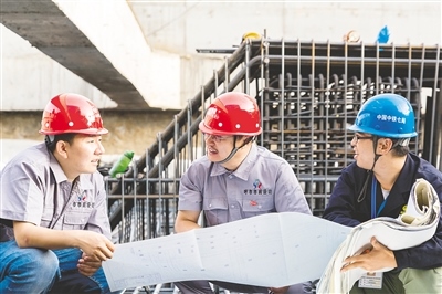 韓佳彤(中)在施工現(xiàn)場為團隊人員指導工作。