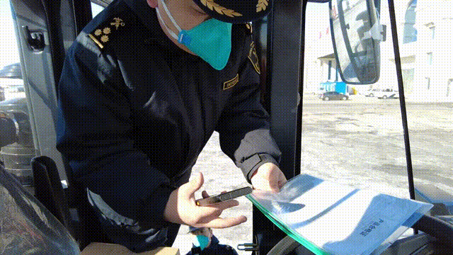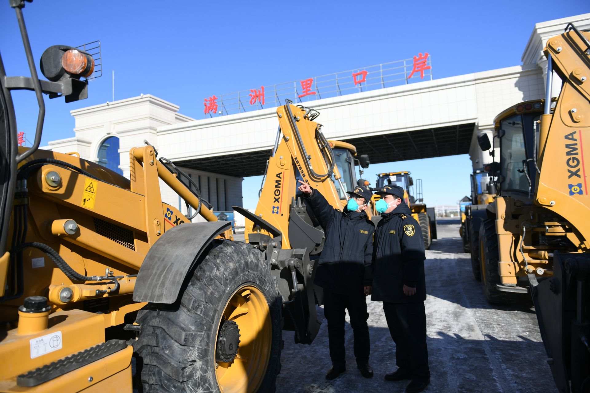 海關(guān)工作人員正在對出口工程機(jī)械車輛進(jìn)行登臨檢查。