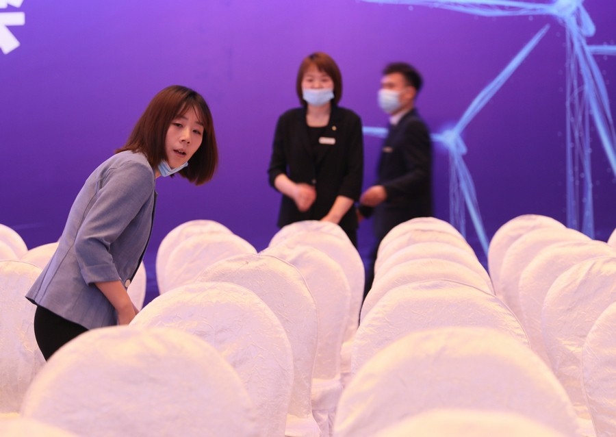 會(huì)場(chǎng)工作人員正在擺臺(tái)