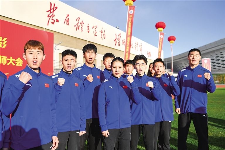 即將參加第一屆全國學(xué)生(青年)運(yùn)動會的我區(qū)運(yùn)動員在動員大會上高呼“團(tuán)結(jié)拼搏、勇創(chuàng)佳績”