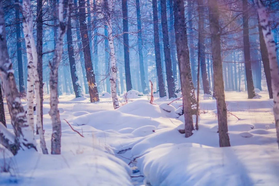 大片白樺樹筆直挺拔的矗立在白雪覆蓋的天地間,漫步其中留下腳印,陽光穿過林間寧靜安詳,樸樹的歌聲不禁在腦海里響起。