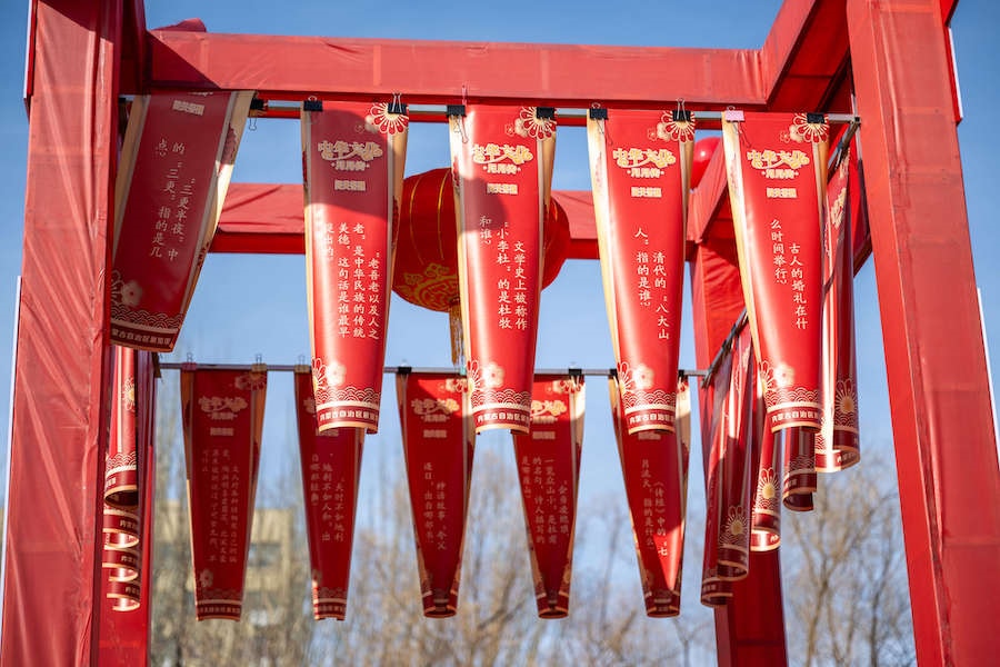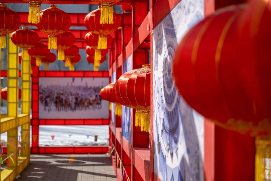 在內(nèi)蒙古展覽館的九曲陣中設(shè)有八個(gè)關(guān)口,每個(gè)關(guān)口懸掛著印有感黨恩、北疆文化、冰雪旅游、中華詩詞、傳統(tǒng)年俗等有關(guān)的知識(shí)問答彩旗。