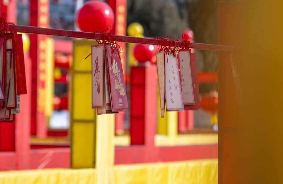 在九曲中,有九道門,其中八道門可以猜燈謎,猜對(duì)后換一張祈??▉淼郊殚T進(jìn)行許愿祈福。