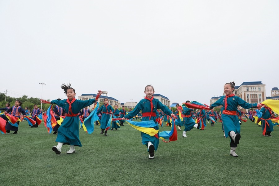 北疆新聞鄂爾多斯5月29日電(記者 張楊)“我們以鑄牢中華民族共同體意識(shí)為主線(xiàn),創(chuàng)建了4個(gè)‘千人文化’特色課程,分別為千人足球、千人《江格爾》、千人筷子舞、千人棋類(lèi)?!?月29日,內(nèi)蒙古鄂爾多斯鄂托克前旗“美育潤(rùn)心·筑夢(mèng)同行”第十四屆中小學(xué)師生藝術(shù)節(jié)暨慶“六一”國(guó)際兒童節(jié)多彩大課間操展示活動(dòng),在鄂托克前旗第一小學(xué)舉行。該校校長(zhǎng)阿拉騰達(dá)來(lái)接受記者采訪(fǎng)時(shí)表示,創(chuàng)建這個(gè)特色課程的主要目的,是培養(yǎng)孩子多方面的才藝,為祖國(guó)培養(yǎng)有用之才。