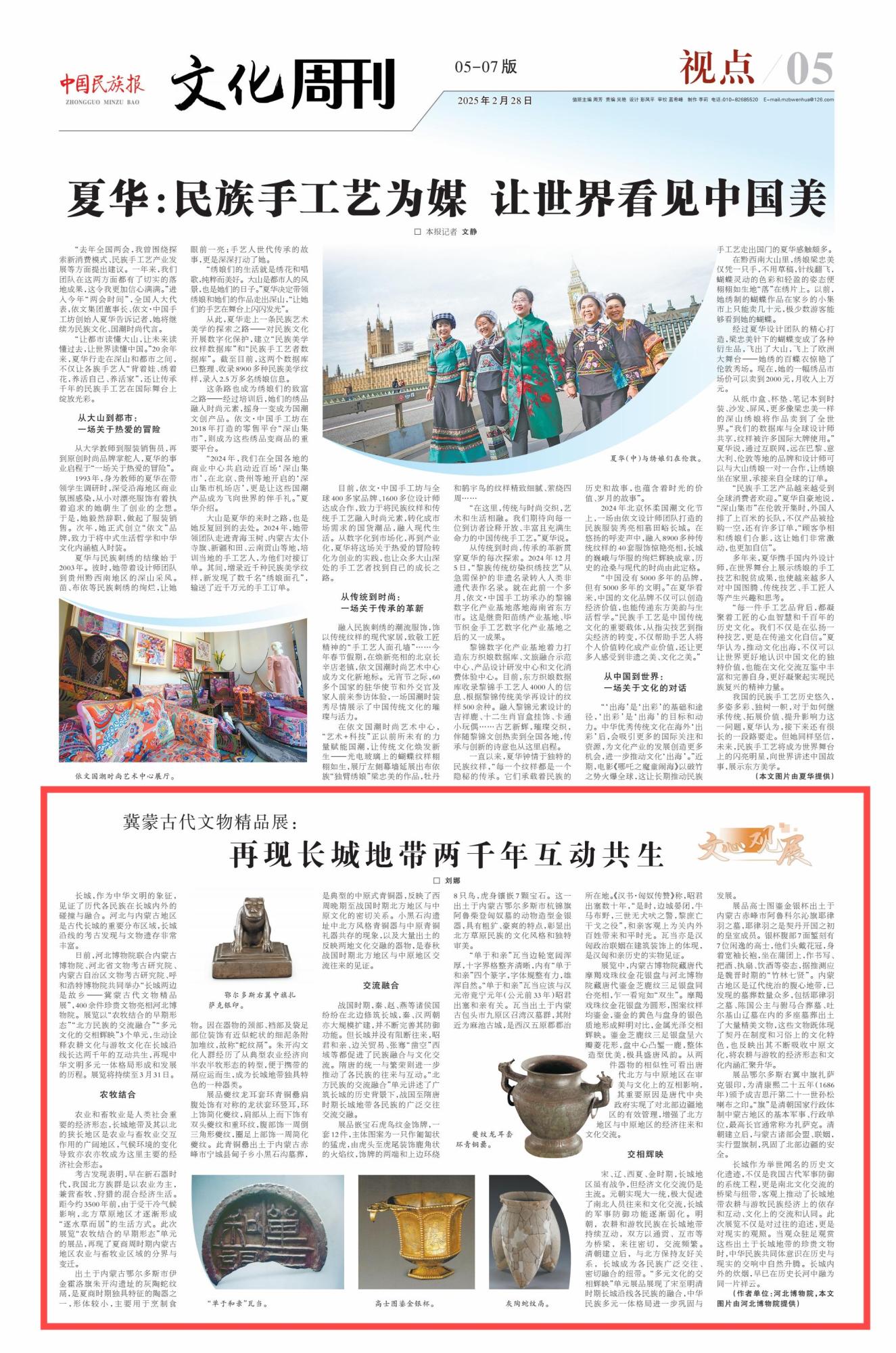 2025年2月28日,《中國民族報》第5版刊發(fā)題為《冀蒙古代文物精品展:再現(xiàn)長城地帶兩千年互動共生》的文章,報道了河北博物院聯(lián)合內(nèi)蒙古博物院、河北省文物考古研究院、內(nèi)蒙古自治區(qū)文物考古研究院、呼和浩特博物院共同舉辦“長城兩邊是故鄉(xiāng)——冀蒙古代文物精品展”,400余件珍貴文物亮相河北博物院。