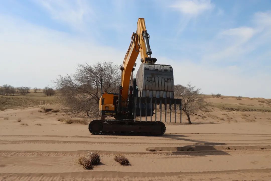據(jù)錫林浩特市二蛋牧民養(yǎng)殖專業(yè)合作社負責(zé)人介紹,在傳統(tǒng)的沙漠治理作業(yè)中,工人需要手動栽植黃柳等固沙植物。然而,人工種植不僅效率低,勞動強度也大。為突破這一困境,合作社成員經(jīng)過多次試驗,最終決定對挖掘機進行創(chuàng)新改造,加裝叉具,這一巧妙的設(shè)計不僅實現(xiàn)了對黃柳種植深度和間距的精準(zhǔn)把控,還能有效避免土壤翻動,最大程度地保持了土壤水分,切實保護了沙地的生態(tài)環(huán)境?! ?/p>