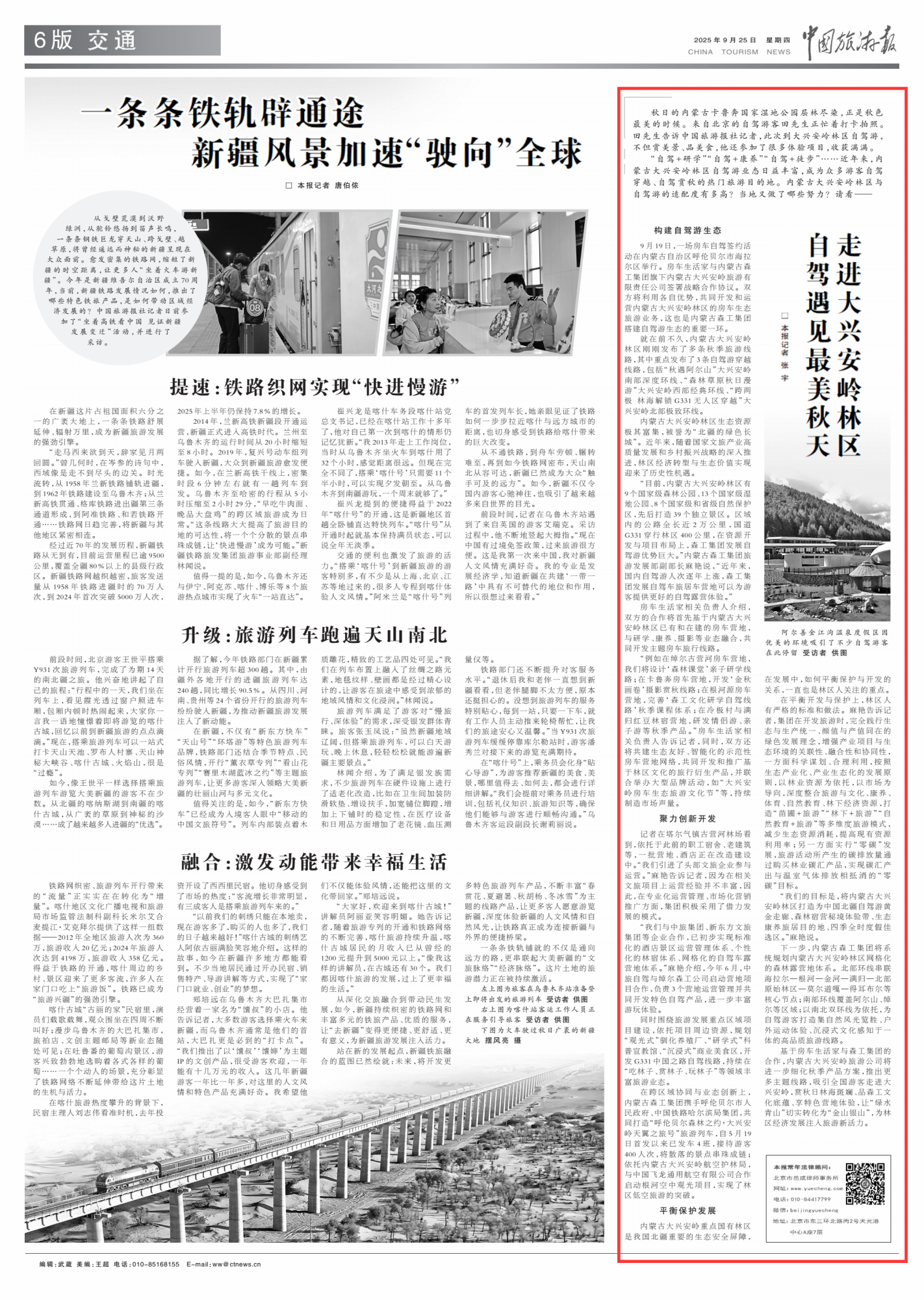 2025年9月25日,《中國(guó)旅游報(bào)》第6版刊發(fā)題為《走進(jìn)大興安嶺林區(qū) 自駕遇見最美秋天》的文章,報(bào)道了“自駕+研學(xué)”“自駕+康養(yǎng)”“自駕+徒步”……內(nèi)蒙古大興安嶺林區(qū)自駕游業(yè)態(tài)日益豐富,成為眾多游客自駕穿越、自駕賞秋的熱門旅游目的地。