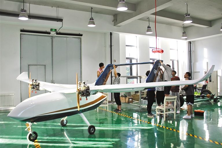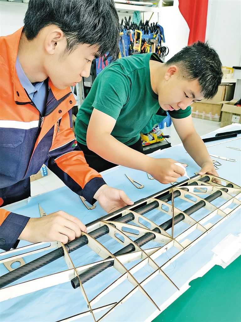 內(nèi)蒙古工業(yè)大學(xué)智能裝備研究院工作人員正在進(jìn)行TS300長航時(shí)大載重固定翼無人運(yùn)輸機(jī)室內(nèi)組裝工作。