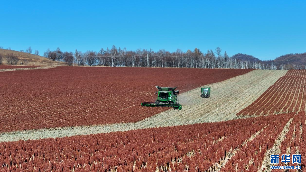 ??10月22日,在內(nèi)蒙古自治區(qū)呼倫貝爾農(nóng)墾綽爾河農(nóng)牧場有限公司田間,農(nóng)場員工正在收獲高粱。新華網(wǎng)發(fā)(哈園碩 攝)