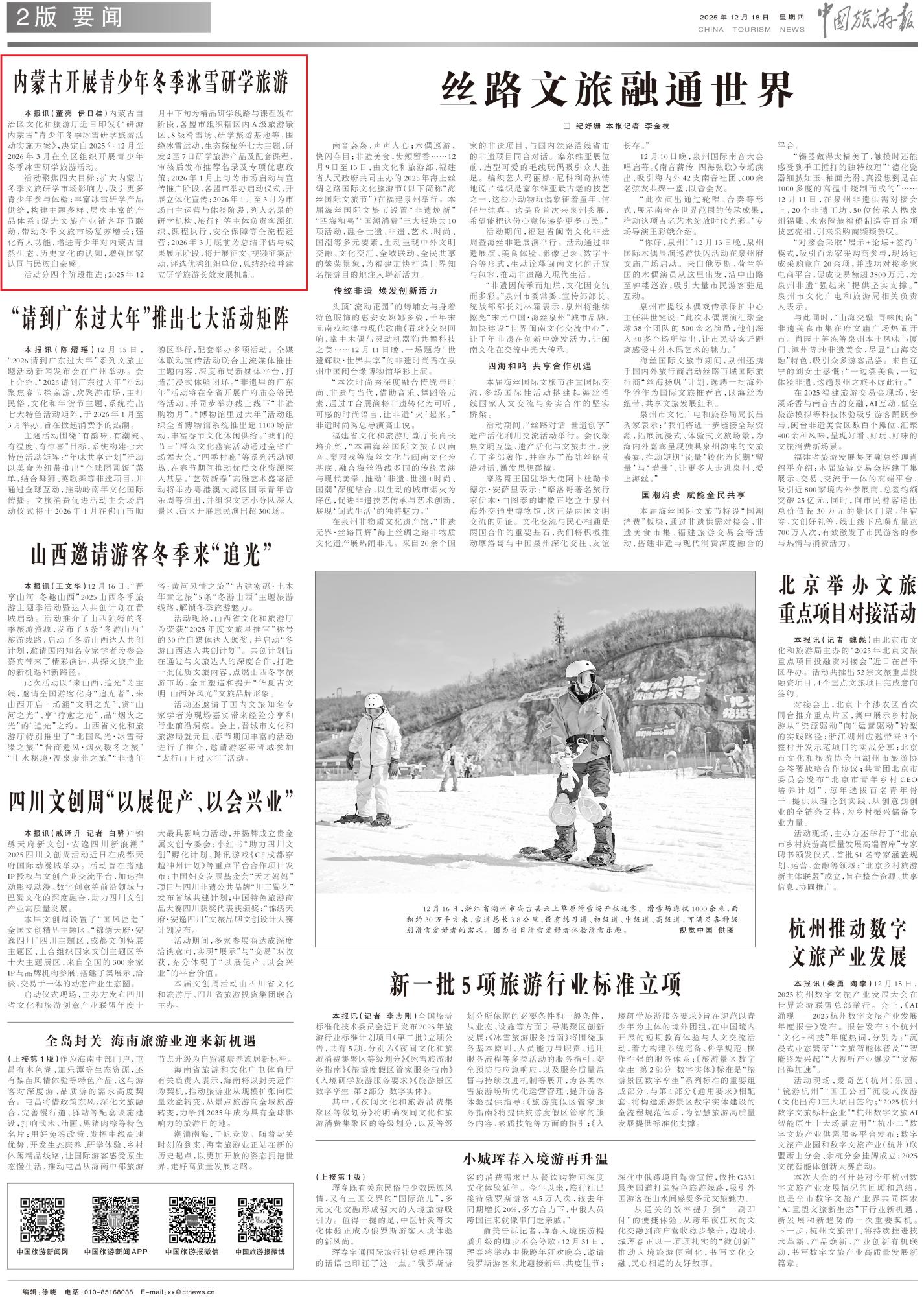 2025年12月18日《中國旅游報(bào)》第2版刊發(fā)了《內(nèi)蒙古開展青少年冬季冰雪研學(xué)旅游》的文章,報(bào)道了內(nèi)蒙古自治區(qū)文化和旅游廳近日印發(fā)《“研游內(nèi)蒙古”青少年冬季冰雪研學(xué)旅游活動實(shí)施方案》,決定自2025年12月至2026年3月在全區(qū)組織開展青少年冬季冰雪研學(xué)旅游活動。