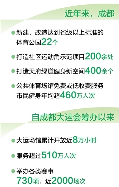 成都市體育局副局長陳志表示:“近年來,成都新建、改造達到省級以上標準的體育公園22個,打造社區(qū)運動角示范項目200余處、天府綠道健身新空間400余個,公共體育場館免費或低收費服務市民健身年均超460萬人次?!?/p>