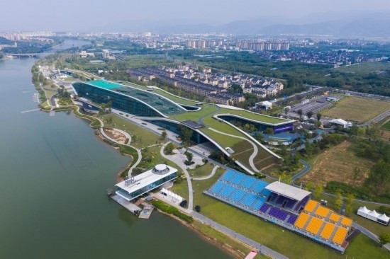 8月24日,空中俯瞰杭州富陽水上運(yùn)動(dòng)中心,屋頂被綠植覆蓋。新華社記者 徐昱 攝