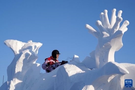 1月7日,選手在哈爾濱太陽島雪博會園區(qū)進(jìn)行雪雕創(chuàng)作。