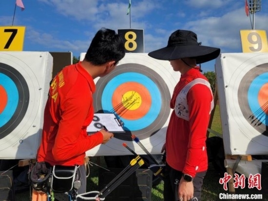 國家體育訓練南方基地(海南白沙·綜合),一輪射箭之后,運動員在查看中靶情況。中新網(wǎng)記者王曉斌攝