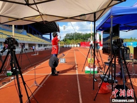 國家體育訓練南方基地(海南白沙·綜合),國家射箭隊紅隊在進行一場隊內賽。 中新網(wǎng)記者 王曉斌 攝