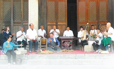 有靜也有動。如今,村中常有當(dāng)?shù)卮迕窈头沁z傳承人自發(fā)組織的“中莊秧歌”“打鐵花”等非遺演出,吸引不少游客。在司徒第院內(nèi),樹齡超400年的臘梅依舊枝繁葉茂。樹下,一位穿著白大褂、扎著白頭巾的老漢與一旁穿著紅襖藍(lán)裙的老太太一同上場,來到院內(nèi)的月臺上,一唱一和,用晉城方言演起了節(jié)目。這是村民崔有正、牛玉鳳夫婦,他們曾經(jīng)是部隊文藝骨干,現(xiàn)在利用閑暇表演。