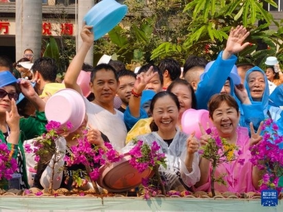 當(dāng)日,云南省西雙版納傣族自治州舉行潑水狂歡活動(dòng),人們歡聚在景洪市潑水廣場(chǎng),用相互潑水的方式互送祝福,慶祝潑水節(jié)。