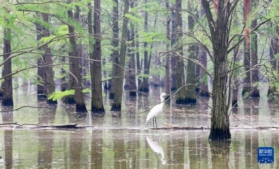 4月23日,鳥(niǎo)兒在池杉林間休憩。