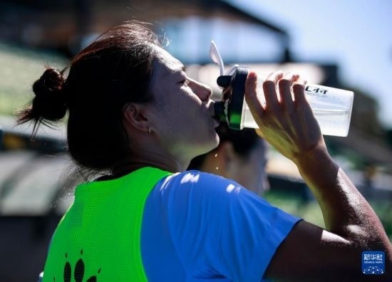 4月26日,中國女曲隊球員谷丙鳳在集訓(xùn)間隙補充水分。新華社記者 馬平 攝