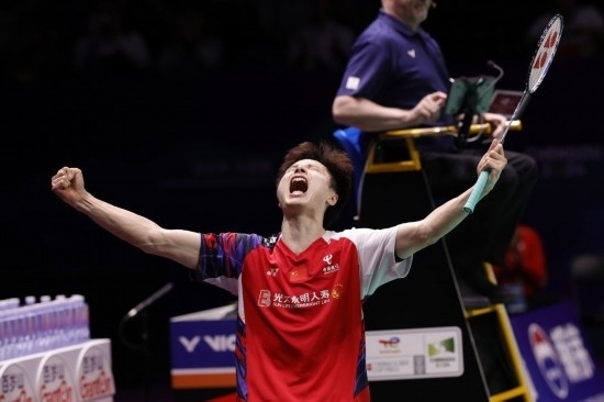 5月5日,中國隊選手石宇奇在男子單打比賽后慶祝獲勝。新華社記者 沈伯韓 攝