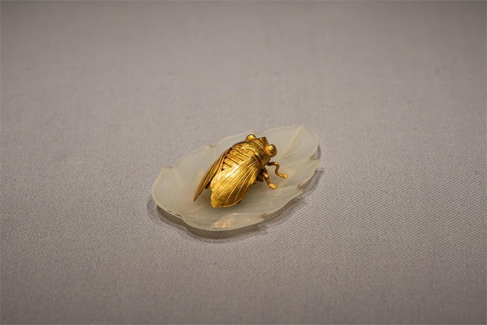 金蟬玉葉是南京博物院的鎮(zhèn)院之寶之一,是500年前貴族女子發(fā)髻上的一件時尚單品。在《玉潤中華——中國玉器的萬年史詩圖卷》大展上,它也是“網(wǎng)紅文物”之一。形神畢肖、金光閃耀的蟬棲憩在玉葉上,它嘴巴微張好似在奏鳴,玉葉葉脈分明,細薄呈凹弧狀,經(jīng)鑒定金蟬含金量達到95%,而蟬翼厚度僅為0.2毫米,工藝精致且繁復(fù)。