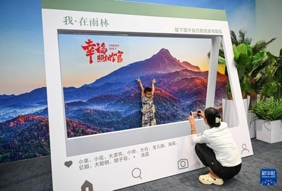 10月13日,在“守護(hù)雨林家園——海南熱帶雨林國家公園建設(shè)主題展”現(xiàn)場,觀眾與海南熱帶雨林背景墻留影。