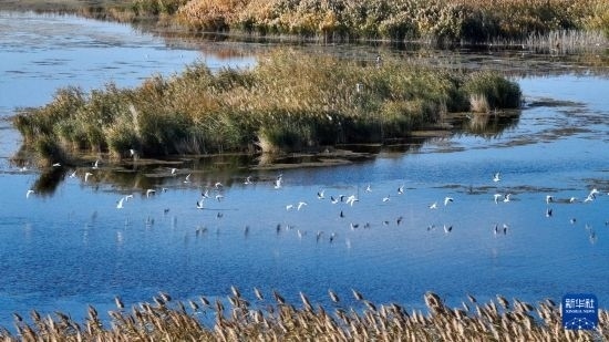 10月14日在居延海景區(qū)拍攝的水鳥(無人機照片)。