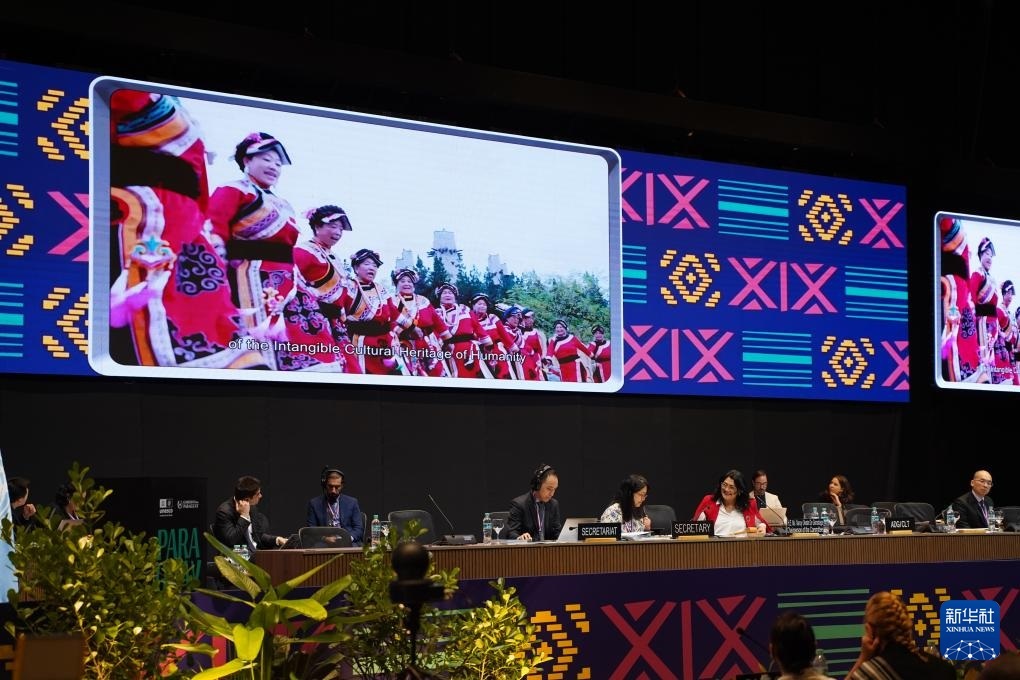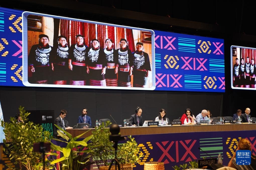 12月5日,在巴拉圭亞松森聯(lián)合國教科文組織保護非物質(zhì)文化遺產(chǎn)政府間委員會第19屆常會評審現(xiàn)場,大屏幕播放“黎族傳統(tǒng)紡染織繡技藝”宣傳視頻。新華社記者 朱雨博 攝