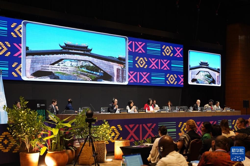 12月5日,在巴拉圭亞松森聯(lián)合國教科文組織保護非物質(zhì)文化遺產(chǎn)政府間委員會第19屆常會評審現(xiàn)場,大屏幕播放“中國木拱橋傳統(tǒng)營造技藝”宣傳視頻。新華社記者 朱雨博 攝
