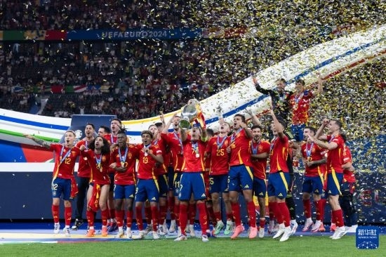 這是2024年7月14日,西班牙隊在2024歐洲足球錦標賽決賽后的頒獎儀式上慶祝。新華社記者 肖藝九 攝