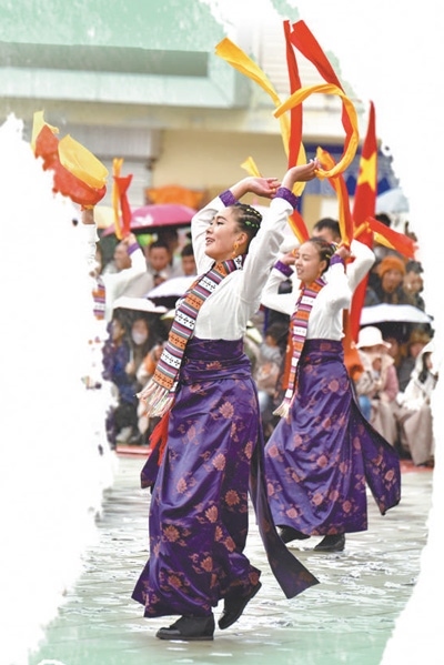 春節(jié)假期,每到傍晚時(shí)分,四川省阿壩藏族羌族自治州若爾蓋縣城中心的北上廣場都會準(zhǔn)時(shí)響起歡快的鍋莊曲,遠(yuǎn)道而來的游客與當(dāng)?shù)厝罕娨黄鹛饸g快的鍋莊。伴著音樂,鮮艷的長袖在風(fēng)中劃出道道弧線,腰飾隨著舞步搖曳,男女老少圍成一圈、翩然起舞。