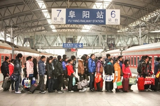 元宵節(jié)剛過,返程旅客在阜陽站排隊(duì)等候上車。