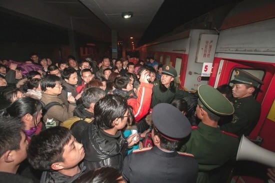 正月初六,河南駐馬店站武警戰(zhàn)士引導(dǎo)旅客登車。