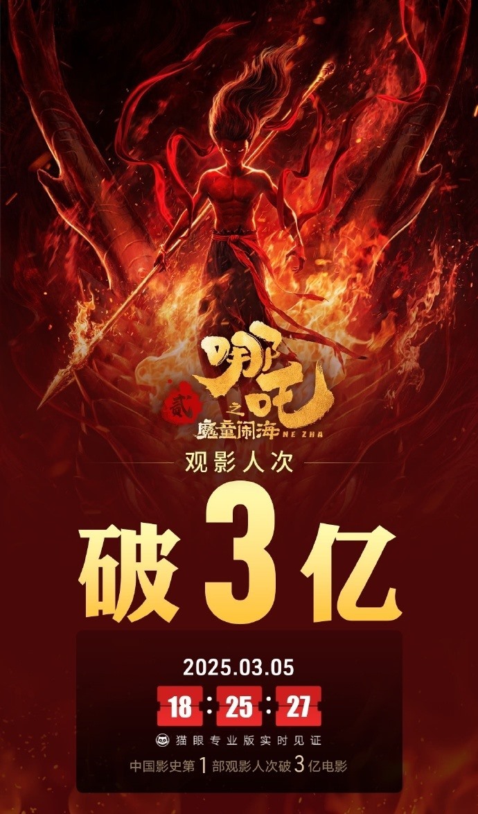 中國影史首部!《哪吒2》觀影人次破3億