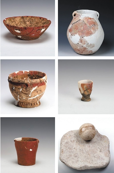 外圍人工土臺一般用純凈的黃褐色黏土堆筑而成,大多呈東西向的長方形。土臺上目前已揭露房址2處、灰坑23座、器物坑28座、高等級墓葬3座。墓葬的墓坑呈長方形,東西向或南北向。隨葬陶器較多,均在20件以上,主要有平底罐、圈足罐、大口盆等,有的墓葬還隨葬石器。從隨葬品的數(shù)量看,等級較高,說明在稻作農(nóng)業(yè)經(jīng)濟的支撐下,距今9000年左右,上山文化社會較早地出現(xiàn)了社會分化。