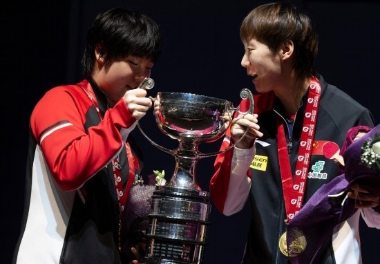 5月25日,冠軍中國組合王曼昱/蒯曼(左)在頒獎儀式上。當日,在卡塔爾多哈舉行的2025世界乒乓球錦標賽女子雙打決賽中,中國組合王曼昱/蒯曼3比0戰(zhàn)勝波爾卡諾娃(奧地利)/斯佐科斯(羅馬尼亞)組合,奪得冠軍。新華社記者 肖藝九 攝