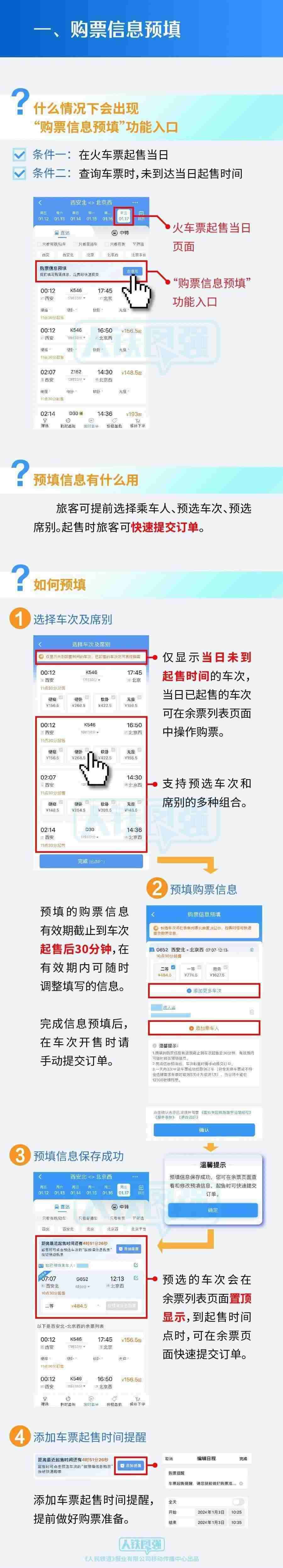 旅客朋友可于車票起售當日,預先填寫乘車人、車次、席別等信息,在車票開始發(fā)售時一鍵提交訂單并完成支付,使旅客購票更便捷。