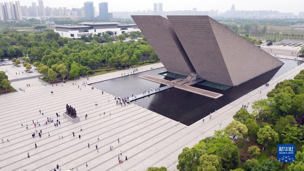 游客在渡江戰(zhàn)役紀(jì)念館參觀游覽(2021年5月3日攝,無人機照片)。新華社記者 周牧 攝