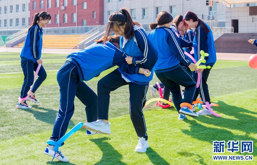 6月18日,內(nèi)蒙古自治區(qū)呼和浩特市第十二中學(xué)高三學(xué)生在進(jìn)行踩氣球游戲。 新華網(wǎng)發(fā)(丁根厚攝) -