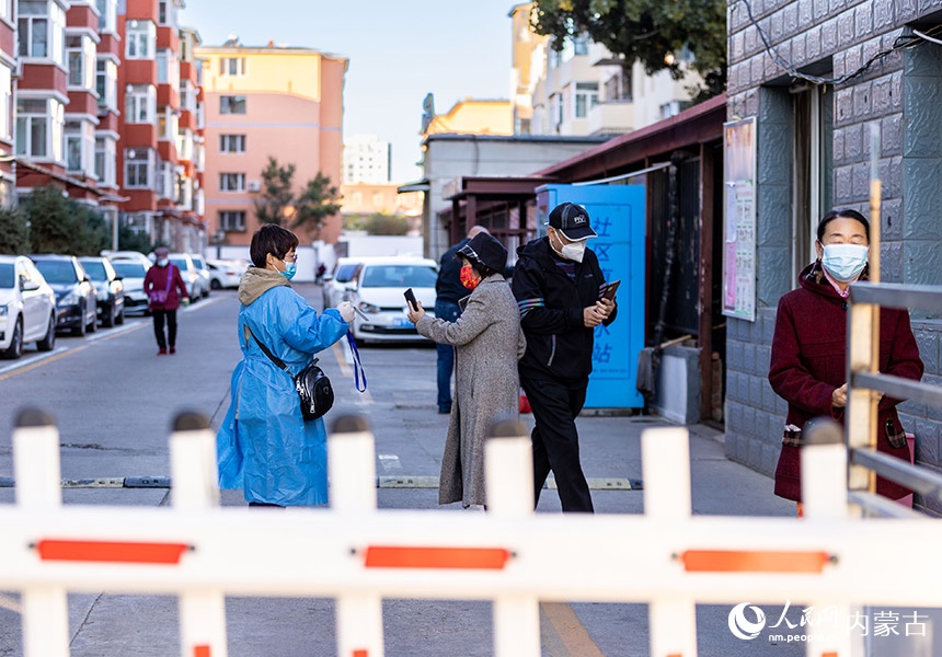 呼和浩特市玉泉區(qū)一處住宅小區(qū),社區(qū)網格員在查驗準備去核酸檢測點居民的健康碼。丁根厚攝 -